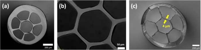 而 Cordeiro 教授开发了一种替代系统,能够在和微波炉差不多的设备上对原料进行拉丝。在Cordeiro的设置中,透明的热塑性聚合物颗粒被送入该设备,随后该设备将其熔化,并通过一个定制的钛喷嘴将熔融的材料挤出。根据该喷嘴的配置方式,被挤出的细光纤可以是实心的,也可以有多条空气通道纵向穿过其内部--后者被称为微结构光纤,或MOF。
