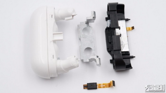 另一面可以看出充电盒内部采用类似三明治结构设计,PCB板和LED灯之间通过排线连接,夹层之间是一块电芯。