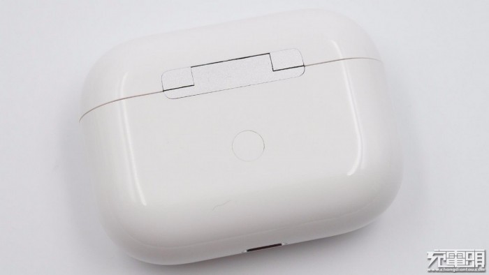 充电盒背面一览,金属合页主体横跨充电盒上盖与下部,下方有一颗配对按键。而AirPods Pro国行版充电盒在合页和按键之间还印有设计和制造信息,这里已初露端倪。