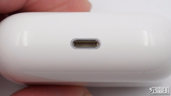 充电盒底部的闪电充电口特写,和正版相比做工要粗糙得多。