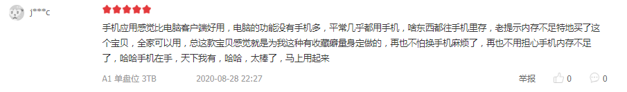 此次联想个人云存储A1在京东商城获得广大用户认可,从大家的留言来看,外观的时尚大气、超高颜值、快速上手、高速传输、专业NAS级硬盘、性价比等都是大家关注的焦点,用户所说的“靠谱”“简单又好用”“价格还不错”等也说明这款产品在用户是值得可定的。
