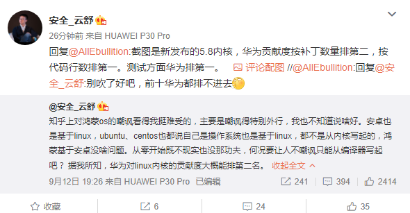 随后@安全_云舒亮出了最新的Linux 5.8内核的贡献排名,指出华为贡献度按不定数量盘爱明第二,按代码数排名第一,测试方面也排第一。