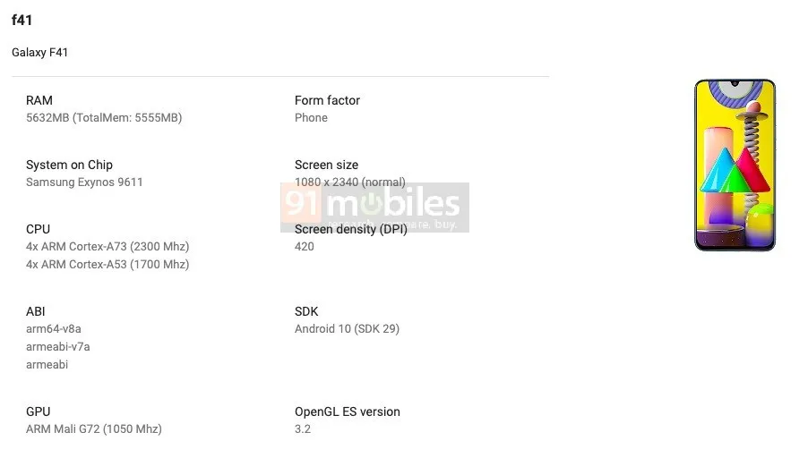 规格方面,三星Galaxy F41将搭载Exynos 9611,这是Galaxy M31和其他几款三星中端产品一直在用的处理器,搭配ARM Mali G72 GPU和6GB RAM。这与昨天MySmartPrice发现的Galaxy F41的Geekbench列表一致。这款手机预装Android 10系统,预计将有One UI 2.0定制皮肤运行其上。