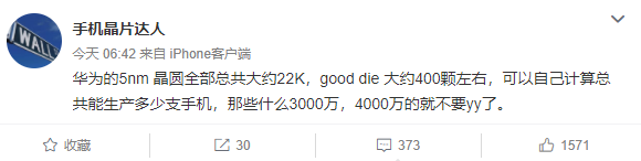 如今,业内人士@手机晶片达人 也给出类似的爆料:“华为的5nm晶圆全部总共大约22K,good die大约400颗左右,可以自己计算总共能生产多少支手机,那些什么3000万,4000万的就不要yy了。 ”