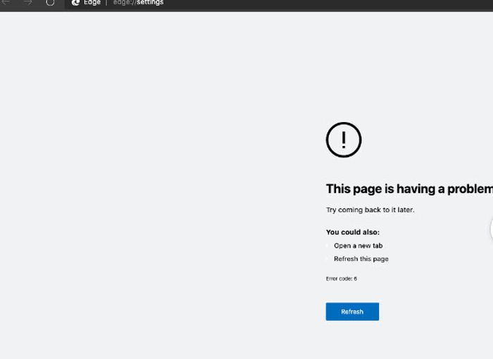 根据报告,每当用户打开一个新的标签或设置或Edge内部页面时,包括扩展程序在内的浏览器都会崩溃,并给出错误页面说:"该页面有问题,请稍后再来试试",错误代号为“ Error 6”,建议打开一个新的标签或刷新页面来解决问题。