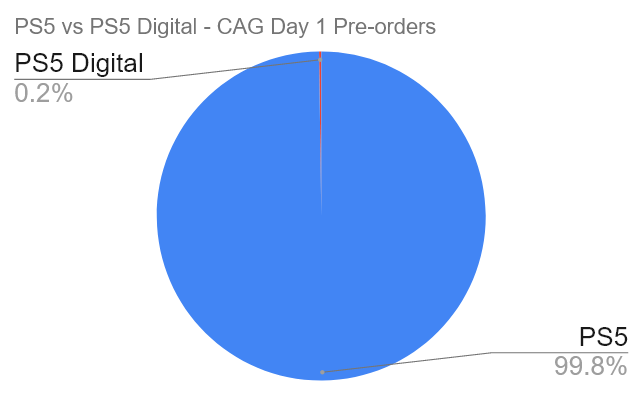 David Abrams在推特上发布了两个版本主机的预购数量图示。他发现在Cheap Ass Gamer预购主机的玩家里面只有不到1%选择了数字版。