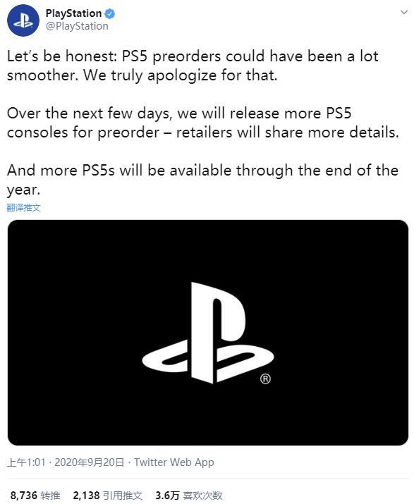 PlayStation官推日前更新消息,就目前PS5出现的预订问题表示道歉,称预订过程本应更流畅一些。另外,官方表示“在接下来的几天中,我们将提供更多PS5预订-零售商将分享更多详细信息。 ”最后,到年底将会有更多PS5主机可供购买。