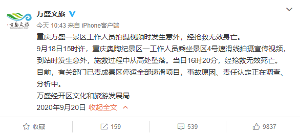 据重庆市万盛经济技术开发区文化和旅游发展局官方微博@万盛文旅 通报,重庆万盛一景区工作人员拍摄视频时发生意外,经抢救无效身亡。
