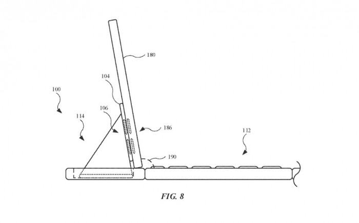 苹果认为,这种类型的铰链组件比传统的铰链组件具有优势。首先,扁平式铰链对组件本身的尺寸依赖性较小,这意味着键盘设备可以做得更薄、更平。该专利还指出,扁平式铰链组件在折叠时可以更好地隐藏起来。有趣的是,专利图片还显示了一个 "额外输入设备 "的空间,它可以在标准QWERTY键盘布局上增加一个触摸板或一排动态输入键。