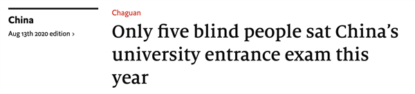 《经济学人》杂志在今年8月13日的一篇文章中写到,今年高考的1070万学生中,只有5人是盲人。自2014年从李金生首次用盲文试卷参加高考后,这一数字从未超过10。
