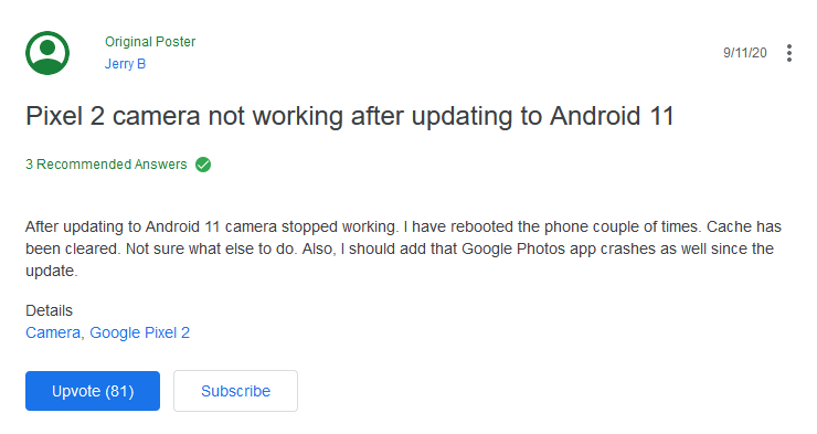 其中一位谷歌Pixel 2用户表示,我对Pixel 2的相机非常满意,但是两天前更新到Android 11之后相机无法正常工作,要么黑屏,要么闪退,我已经清空缓存并重启手机很多次了,但是仍然于事无补。