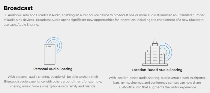 而LE Audio这一广播机制,是可以基于位置的,也就是说当蓝牙耳机漫游到音频广播区域,可以自动切换到相应广播音源。也就是说,你带着蓝牙耳机,进入到某个场所,就可以切换到这个场所特有的蓝牙广播,收听相应信息。