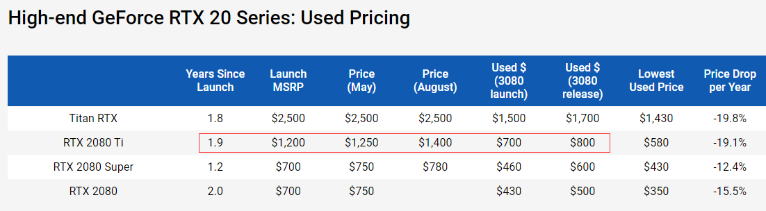 以RTX 20系列显卡为例,RTX 2080 Ti在RTX 3080发布前二手价暴跌到了700美元,不过前者上市之后,RTX 2080 Ti二手价回到了800美元。