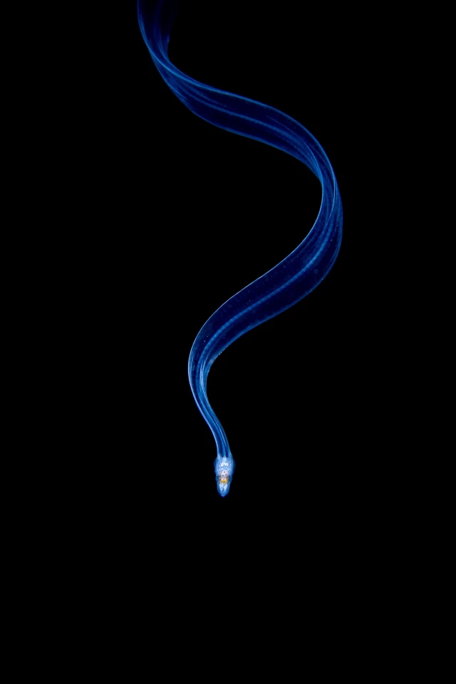 在2020年的比赛中,法国摄影师Galice Hoarau凭借《鳗鱼幼虫》夺得了动物类和总比赛的第一名。这张照片是在印度尼西亚海岸的一次夜间潜水中拍摄的,当时可以看到这些罕见的生物从深海的墨黑色中浮现出来。