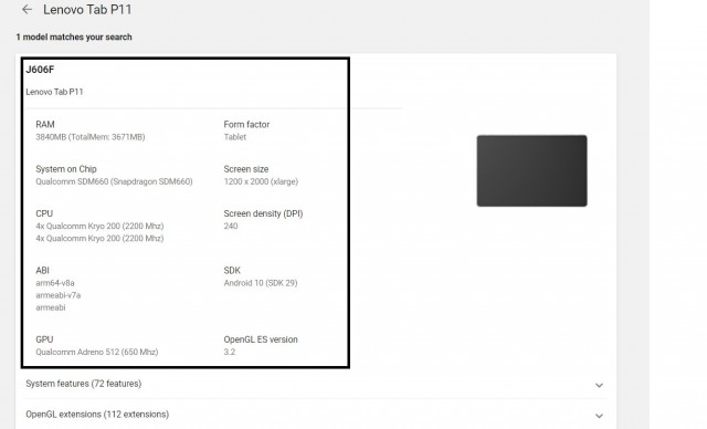 不过目前的信息没有显示该设备正面的详细图像。 此外,Tab P11 还出现在带有 TB-J606F 型号的 Google 支持的设备列表中。该列表没有附带任何其他规格,但确实表明 P11 这款产品即将推出。