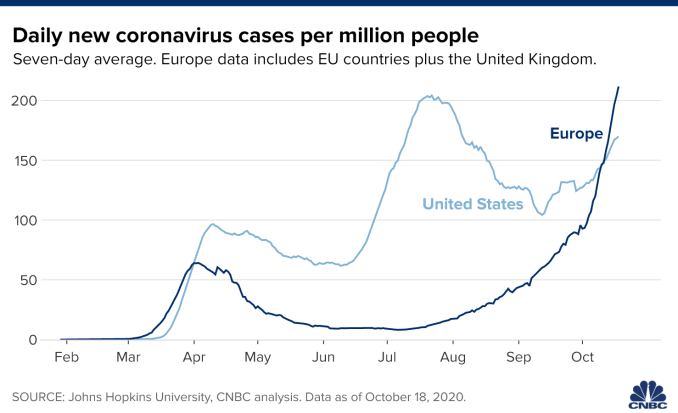 在过去一周内,欧洲的确诊病例增长44%。意大利18日宣布该国新增确诊病例11705例,创下疫情高峰之后的单日新增病例纪录。意总理孔特18日表示,各市长将有权在晚上9时之后关闭公共场所,餐厅的开放时间以及就餐人数也将受到限制。17日,法国报告的确诊病例高达32427例,创下新高。法国已经宣布在9个城市实施宵禁。比利时卫生大臣表示,该国几乎被感染“海啸”吞没。从19日起,比利时实行从零时到5时的宵禁。此外,咖啡馆、酒吧和餐馆也关闭4周,并禁止在20时之后销售酒精饮料。