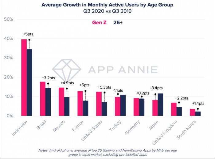 而且 Z 世代和应用之间的交互更加频繁,在非游戏应用中每个用户的会话数增加了 20%,和老年组相比,每月每款应用平均交互 120 次。不过本次调查数据并不全面,仅针对美国,英国,巴西,法国,德国,印度尼西亚,日本,墨西哥,韩国和土耳其等国家和地区,而且仅从 Android 设备上收集数据,因此无法提供完整的洞察。