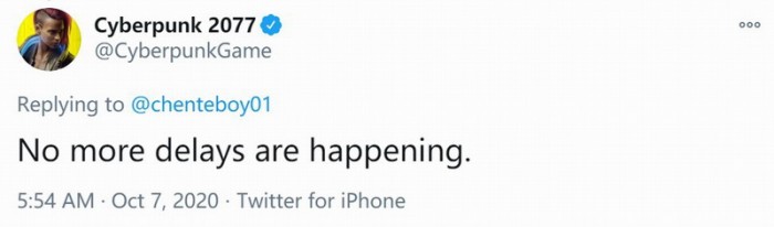 之前CDPR宣布《赛博朋克2077》在10月5日已送厂压盘,10月7日CDPR官方还坚定表示不会再跳票了。10月27日凌晨,有玩家询问CDPR是不是真不跳票了?CDPR说没错。好吧大家都信了,并且美滋滋等待《赛博朋克2077》正式发售,结果游戏还是跳票了。