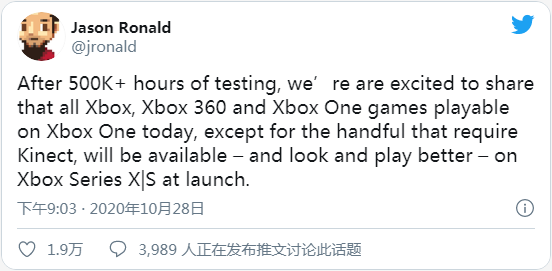 尽管索尼 PS5 在老游戏兼容性上遭到了一些吐槽,但微软 Xbox Series X 这边的情况要好得多。Xbox 项目经理 Jason Ronald 在近日的一条推文中指出:“经过 50 多万小时的测试,我们我们很高兴地宣布,所有 Xbox、Xbox 360 和 Xbox One 上的老游戏,都将能够在 Xbox Series X | Series S 发布时可用”。