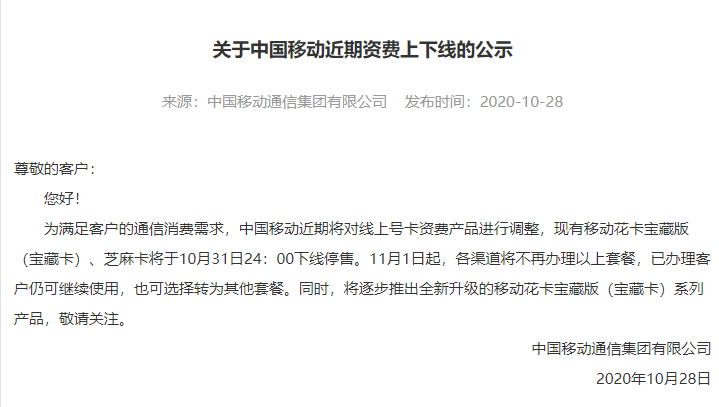 日前,中国移动官网发布《关于中国移动近期资费上下线的公示》,宝藏卡、芝麻卡将下线停售,不再接受办理。公示称,为满足客户的通信消费需求,中国移动近期将对线上号卡资费产品进行调整,现有移动花卡宝藏版(宝藏卡)、芝麻卡将于10月31日24:00下线停售。