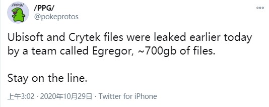 /PGG/表示,这些消息是从育碧和Crytek那里泄露出来的,他从一个名叫Egregor的团队那里一堆700GB的文件中获得了这些消息。