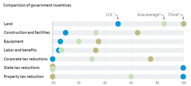 美国历来没有为芯片制造提供联邦级补贴的措施,尽管各州有自己的支持举措,包括补贴土地和税收减免。相比之下,在亚洲,各国通常提供免费或廉价的土地,并在购买制造设备方面提供更多帮助,这些设备占芯片制造的大部分成本。(小小)