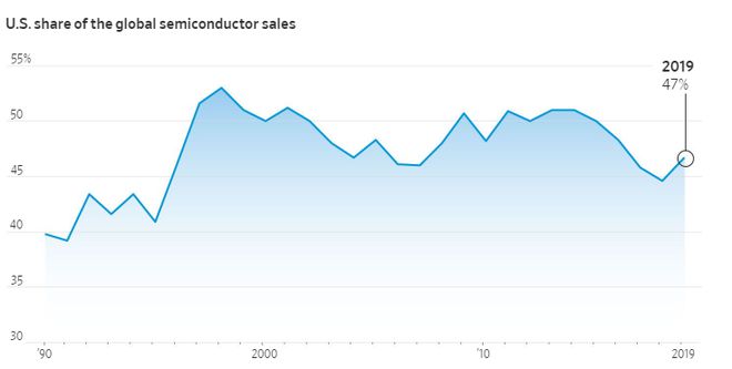 图1:美国芯片公司在全球半导体销售中所占份额变化情况