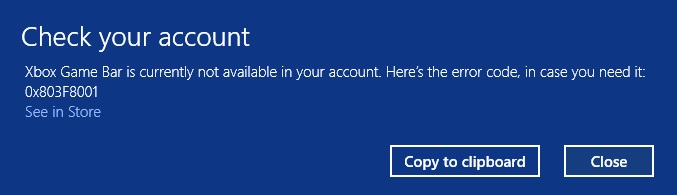 Windows 10的Xbox游戏栏充满了有用的功能,包括一个新的资源监视器,它的工作非常好。 然而,最近的一次服务器端更新使游戏栏崩溃,出现错误0x803F8001。最新的Windows 10错误竟然阻止一些用户访问游戏栏及其服务。有几位用户向我们求助,他们报告了以下错误信息:“Xbox游戏栏目前在您的账户中不可用。请确保您已登录商店并再次尝试。以下是错误代码,如果你需要的话。0x803F8001“。