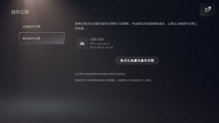 PS5同样支援以外接储存装置来建立扩充储存空间,不过扩充储存空间只能用来安装与游玩PS4游戏,目前PS5还无法将PS5游戏安装资料搬移到扩充储存空间,只能搬移PS4游戏安装资料。储存装置规格要求跟PS4一样,速度要Super SpeedUSB以上、容量要大于250GB小于8TB,要直接连接PS5而不能透过USB Hub。