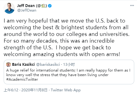 谷歌人工智能高级研究员兼高级副总裁Jeff Dean更关注拜登上台后,签证政策能否回归正常?