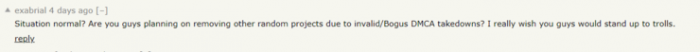 另外,在Friedman回应泄露事件的帖子下可以看到,不少网友对GitHub因DMCA协议而下架YouTube-dl表示不满。