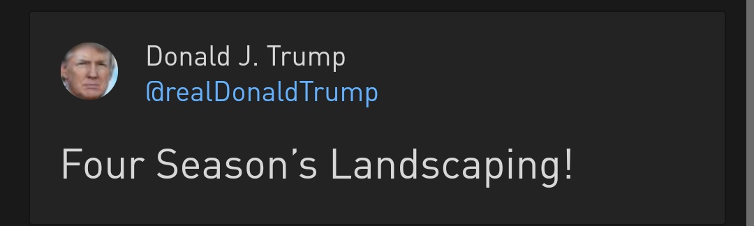 不管怎样,Four Seasons Total Landscaping已经成为这个周末最具代表性的网络迷因之一,它为互联网提供了无尽的娱乐,同时也让一家打广告宣传草坪维护和扫雪的小企业成为了焦点,而这最终可能会成为特朗普竞选团队诗意十足的告别仪式。