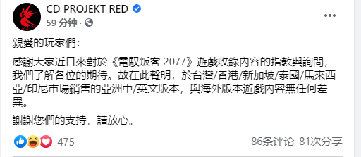 感谢大家近日来对于《赛博朋克2077》游戏收录内容的指教与询问,我们了解各位的期待。故在此声明,于台湾/香港/新加坡/泰国/马来西亚/印尼市场销售的亚洲中/英文版本,与海外版本游戏内容无任何差异。