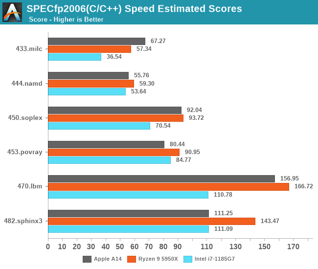 再来看看详细的成绩,再次让我惊讶的是,A14不仅能跟上,而且在429.mcf和471.omnetpp等对内存延迟敏感的工作负载上,A14居然比这两个竞争对手都要强,尽管它们要么拥有相同的内存(i7-1185G7,LPDDR4X-4266),要么拥有桌面级内存(5950X,DDR-3200)。