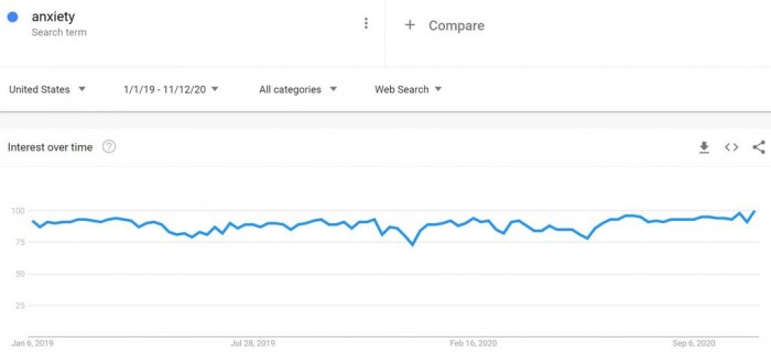 随着美国新冠确诊和住院病例本月创下纪录,更多美国人感到焦虑,不愿意外出就餐或购物。市场研究公司DataTrek的数据显示,上周,谷歌平台“焦虑症”搜索量达到16年来最高水平,“餐馆”和“商场”搜索量则几乎回落至3、4月份以来的最低水平。