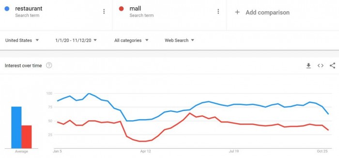拉比表示,“随着天气转冷和确诊病例增加,我们预计‘餐馆’和‘商场’搜索量的下降将会持续,由于堂食可能受到限制,餐馆将面临一个严峻的冬季。拥有高效网络下单/配送业务的零售商在即将到来的圣诞销售季大获成功,它们早早就开始打折销售,但是,鉴于人流量的减少,线下零售商的表现可能不会太好”。