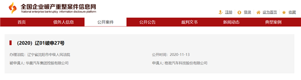 今年11月13日,全国企业破产重整案件信息网发布,华晨汽车集团控股有限公司被申请破产重整,申请人为格致汽车科技股份有限公司,案号为(2020)辽01破申27号。而后者是一家汽车冲压模具研产商,从事汽车冲压模具的设计、研发、制造及销售。