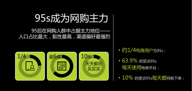 95后是移动互联网的原住民,也是线上消费的主要组成部分。据艾瑞的一组数据显示,1/4电商用户为95后,63.9%受访认表示每天使用电商平台,10%的人每天网购下单。
