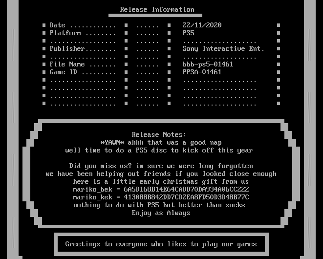 值得一提的是,在被Dump出的PS5游戏镜像的nfo文件中,BigBlueBox还写下了两行以Mariko开头的密钥,疑似与续航版Switch和Lite的破解工作新进展有关。