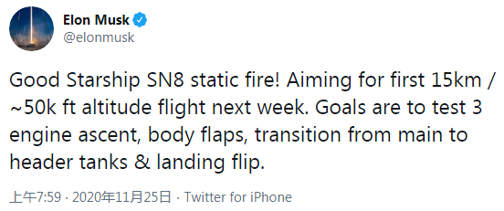 按照计划,SpaceX 将把 SN8 原型送往 9 英里(15 公里)的高空。不过在周二的报告中,马斯克称试射已取得成功,下一步计划将 SN8 送入地球大气层的较低处。