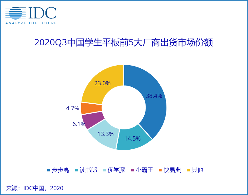 从厂商来看,步步高市场占有率位居第一,出货量占比为38.4%;市场份额位于第二位的读书郎出货量占比为14.5%;优学派处于第三位,占据13.3%的市场份额;小霸王排名第四位,市场份额占比6.1%;快易典凭借4.7%的市场份额,占据第五位。值得关注的是,科大讯飞成为第三季度学生平板市场出货量同比增幅最大的厂商,出货量同比增长接近25%。