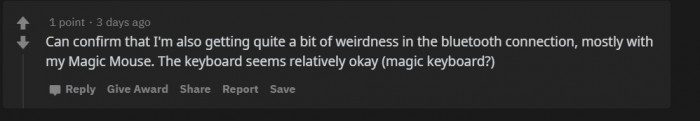 一名用户表示:”当我每次重启设备,我都不能登录,因为键盘和鼠标都没有连上。而当我使用有线鼠标登录进入系统后,蓝牙键盘和鼠标又可以用了。“