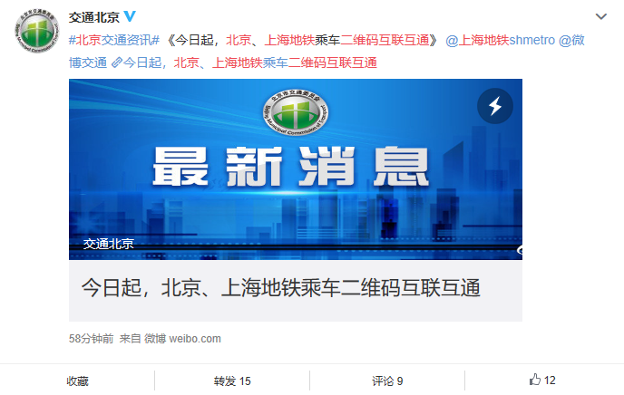 地铁乘车二维码互联互通再传佳讯!据@交通北京报道,12月1日,北京、上海地铁乘车二维码实现互联互通,范围包括两市城市轨道交通所有运营线路和车站(不含市郊铁路)。自此,北京市民可以使用亿通行APP乘坐上海地铁,而上海市民则可以使用Metro大都会APP乘坐北京地铁。