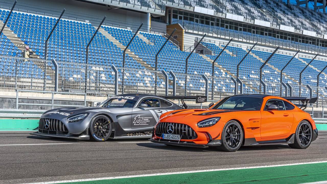 2021款梅赛德斯AMG GT黑色系列是从该品牌的GT3和GT4赛车中汲取关键经验的果实。它配备了一个更大的冷却进气和全新的碳纤维罩和大通风口以此来提供更好的冷却能力和更多的下压力。与此同时,后轴的上下叉骨采用的轴承能在更高的负载下获得稳定的处理。