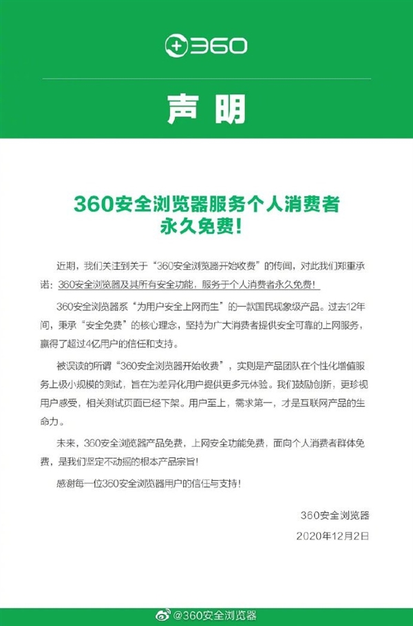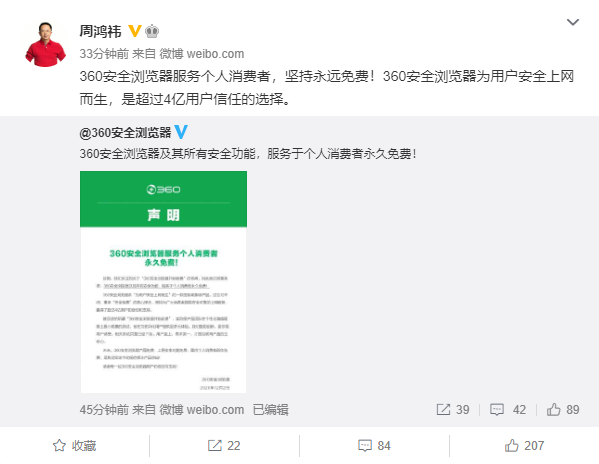 随后,360集团董事长兼CEO周鸿祎也转发该声明称:360安全浏览器服务个人消费者,坚持永远免费!