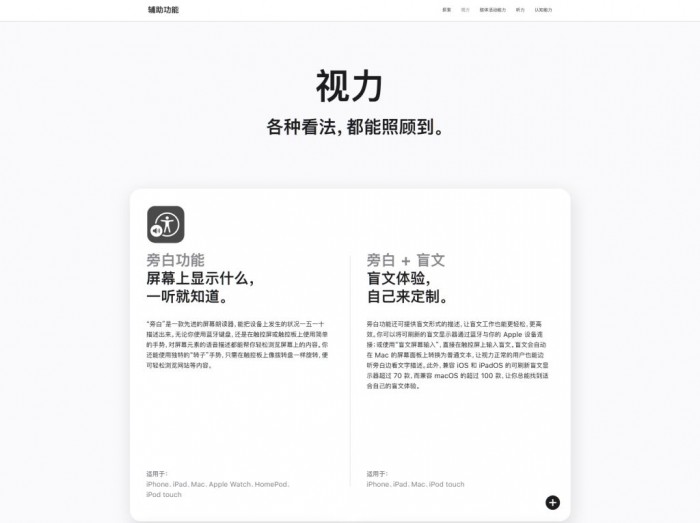 其实这样的例子还有很多,在今日更新的“辅助功能”介绍页面中,苹果官方梳理并更加明确了他们为视觉、听觉、触觉等障碍的使用者提供更加人性化的功能。