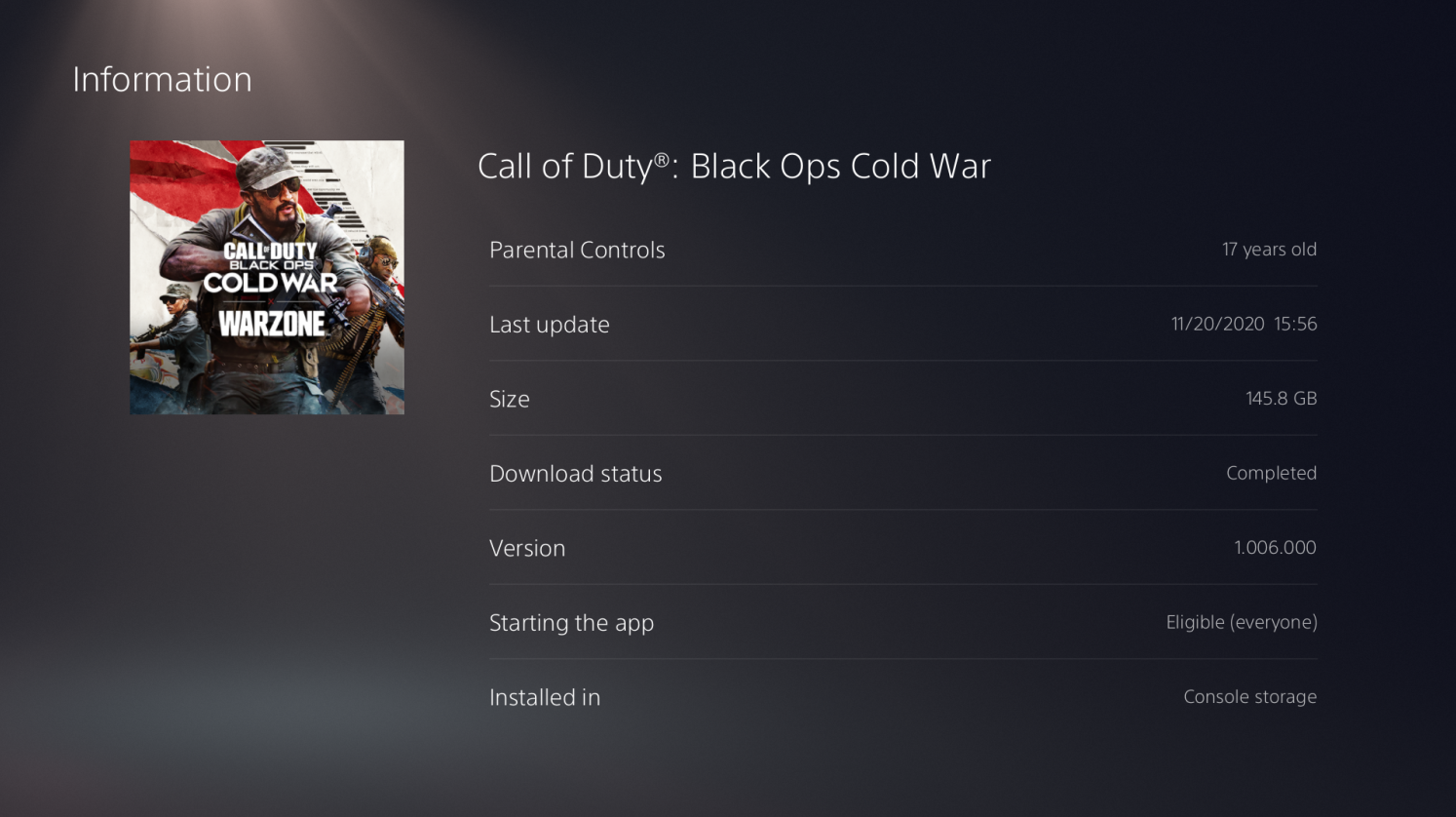 PS5的SSD宣传825GB容量,但在格式化和分配后的实际大小仅667GB。而《使命召唤17:黑色行动冷战》却需要占用145.8G的空间,这相当于是PS5这块SSD的21%——并且这是没有安装《战区》的情况下。其中,大多数数据是语音和对话——这些占用了超过80GB的安装空间。