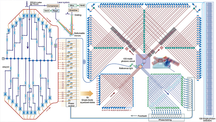 “九章”量子计算原型机光路系统原理图:左上方激光系统产生高峰值功率飞秒脉冲;左方25个光源通过参量下转换过程产生50路单模压缩态输入到右方100模式光量子干涉网络;最后利用100个高效率超导单光子探测器对干涉仪输出光量子态进行探测。制图/陆朝阳 彭礼超(中国科学技术大学供图)