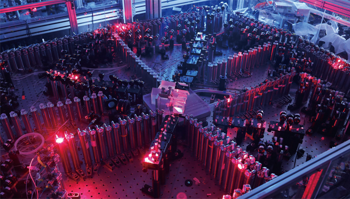 光量子干涉实物图:左下方为输入光学部分,右下方为锁相光路,上方共输出100个光学模式,分别通过低损耗单模光纤与100超导单光子探测器连接。摄影/马潇汉 梁竞 邓宇皓(中国科学技术大学供图)