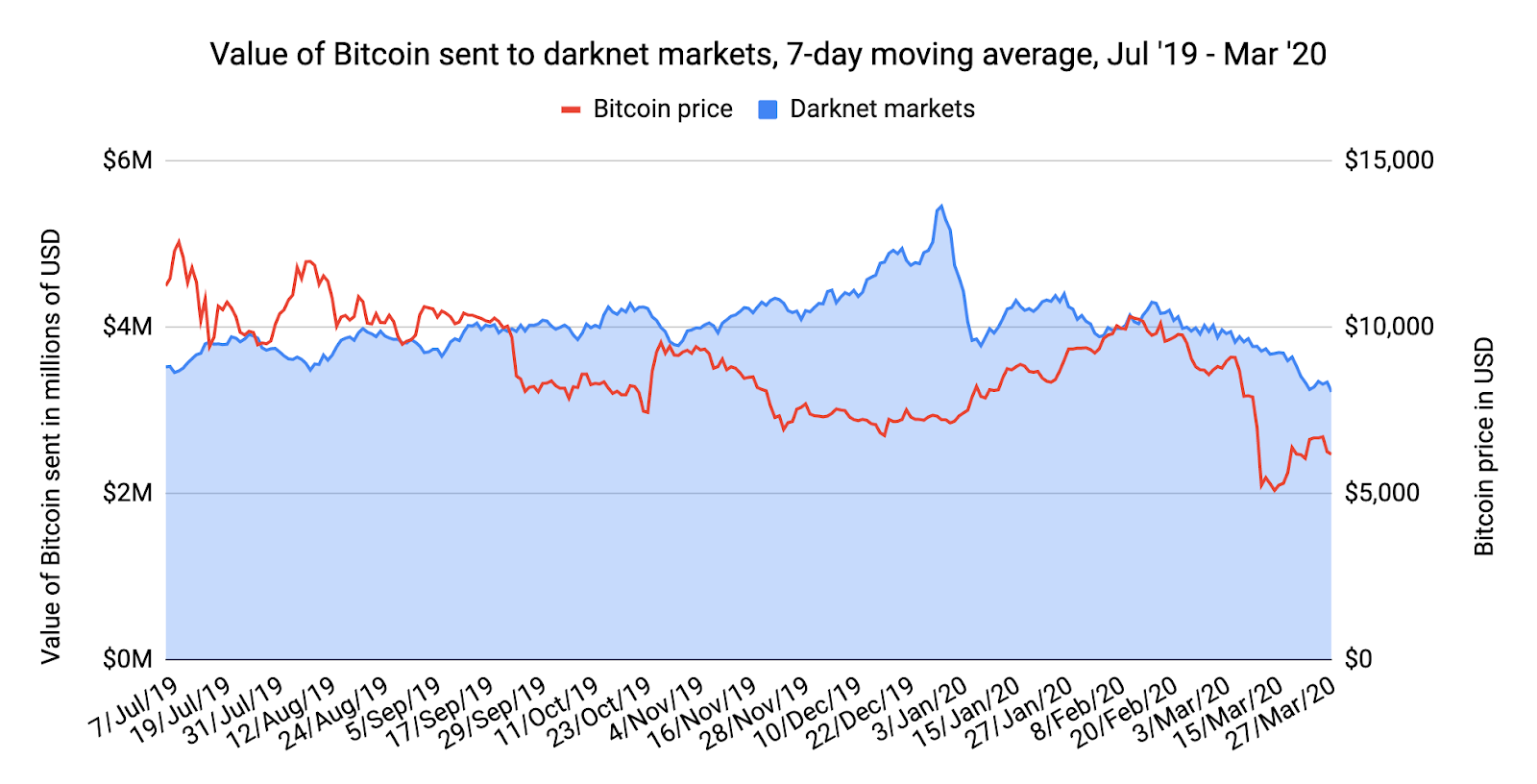 在美国开始因新冠疫情而实施封锁三周之后,该报告检测了疫情对暗网市场活动的影响。结果发现在比特币以及其他加密货币的价值急剧下跌之后,暗网市场的交易活动有所下降。